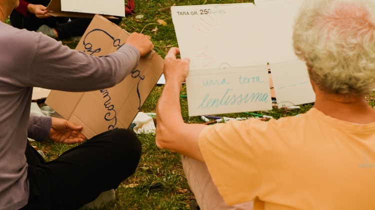 The participants read the poems aloud, then we individually chose a line of one poem and wrote it on a cardboard with a coloured pencil, with the idea to draw attention to the quality of the gesture and the shape of the letters. The cardboards were then circulated in the group to read and “touch” the translations. Then the participants walked to find a place among or inside the spazietto, where they/we wished to locate their cardboard translation. We stopped and read the line to the others two times, listening to create a multivocal composition.
