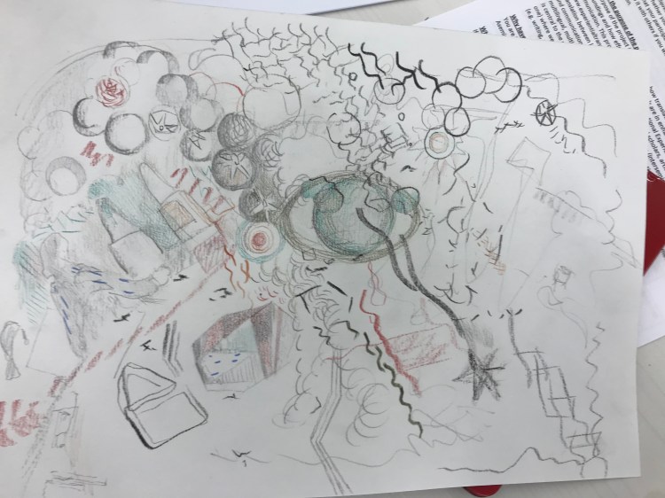While we had started the first session by launching straight into our drawing exercises, for the second session we felt the need for discussion before launching into practice. Given the wide variety of responses from session 1, we found ourselves chasing Scott’s “fruitfulness of incomprehension” [1] more than ever.