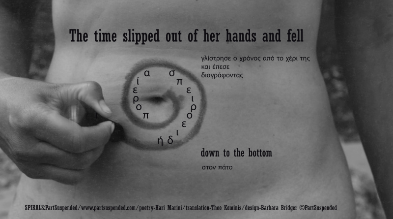 [ii] A collection of essays, under the title ‘On Spirals’, published in European Journal of Women’s Studies, ‘Open Forum’ (2022) 29.1, 155-189, explored different aspects of the SPIRALS project, examining the spiral form as applied to women’s experiences, and making links between various projects and a range of social, cultural, linguistic and philosophical influences: Essays on ‘Spiral as metaphor’ by Barbara Bridger, ‘Desire and rage: A female spiral’ by Georgia Kalogeropoulou, ‘A woman’s spiral in cityscape’ by Hari Marini, and ‘The Female Poet Creates Spirals: A Question of Nomadism?’ by Noelia Diaz-Vicedo.